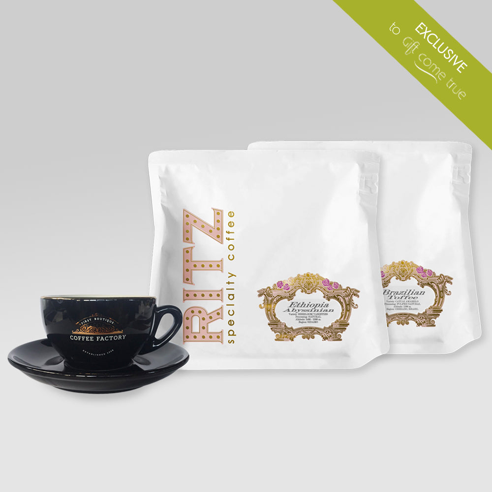 With this offer you give 2 pieces of special coffees x 0,200 kg.: Ethiopia Guji Abyssinian and Brazilian Toffee with a gift of 1 piece of late cup with saucer.