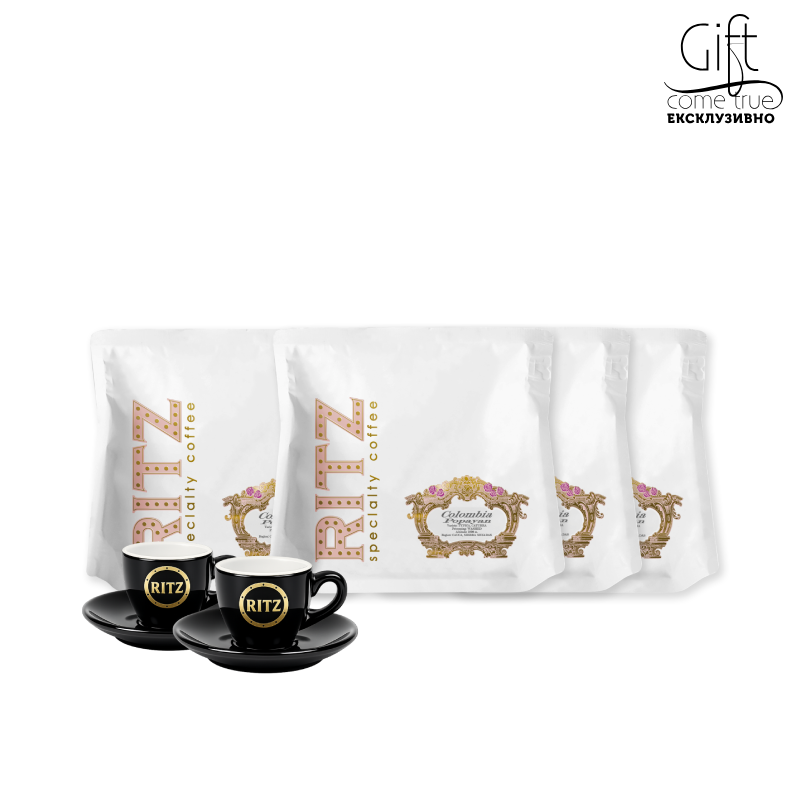 4 special coffees x 0.200 kg: brazilian toffee, colombia popayan, mexico chiapas, blend №8 + 2 espresso cups with saucers