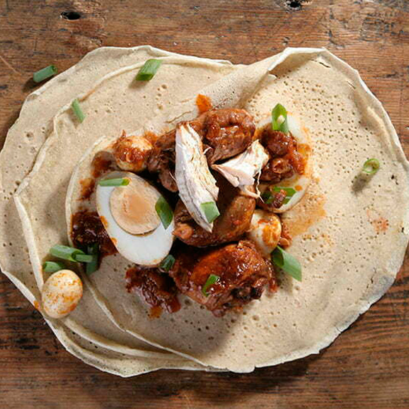 - The famous Ethiopian bread injera, made from the ancient grain teff, used as an edible plate