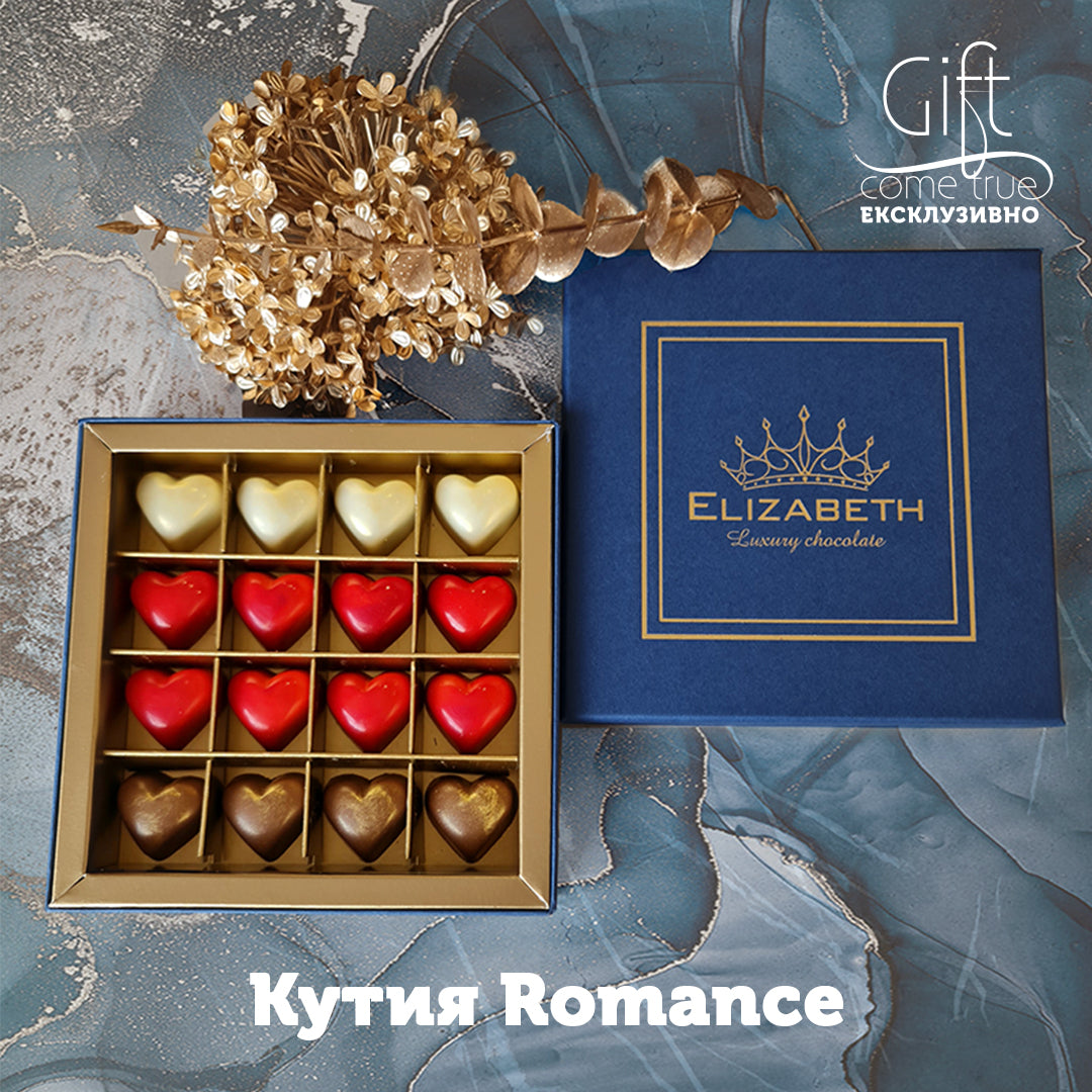 Box "Romance": Luxury box of 16 pralines with Belgian chocolate and: strawberry filling and coconut cream in white and milk chocolate.