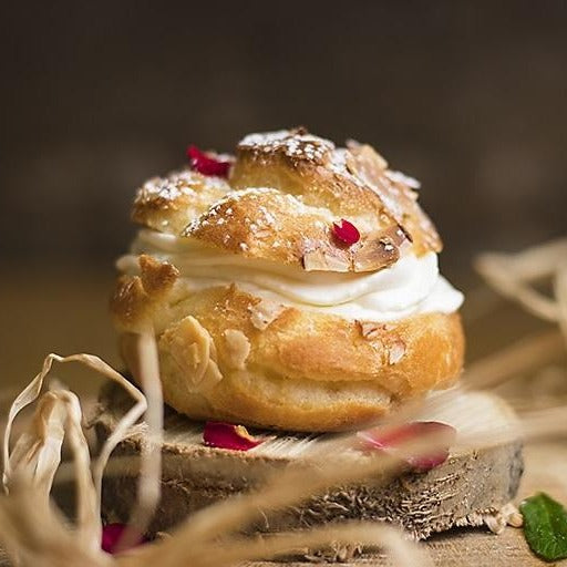 - Choux a la crème filled with crème patissiere. white icing and rose petals