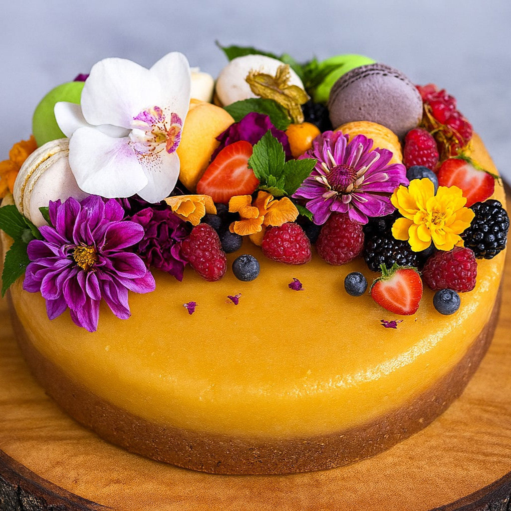 a naturally stunning decoration of fresh and dried flowers, French macarons, seasonal fruits, nuts, and chocolate