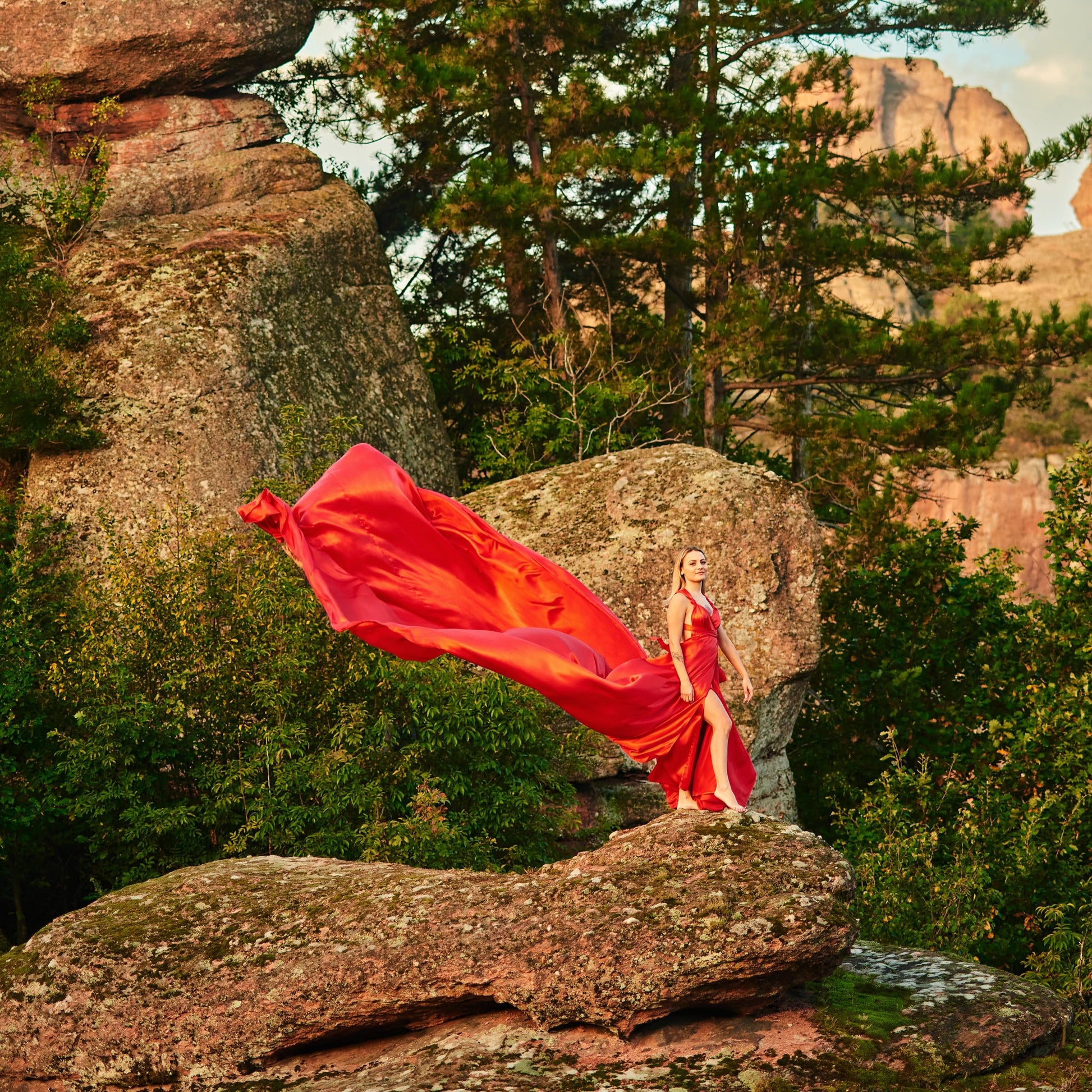 Flying dress photo shoot at the Belogradchik rocks