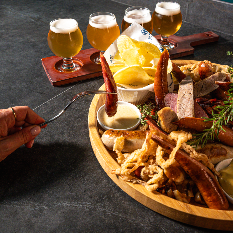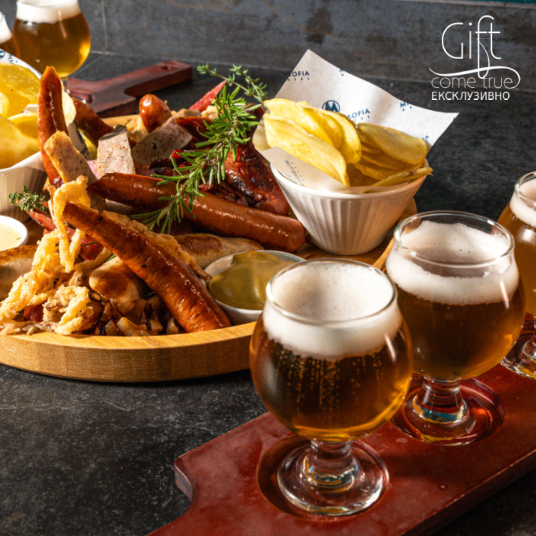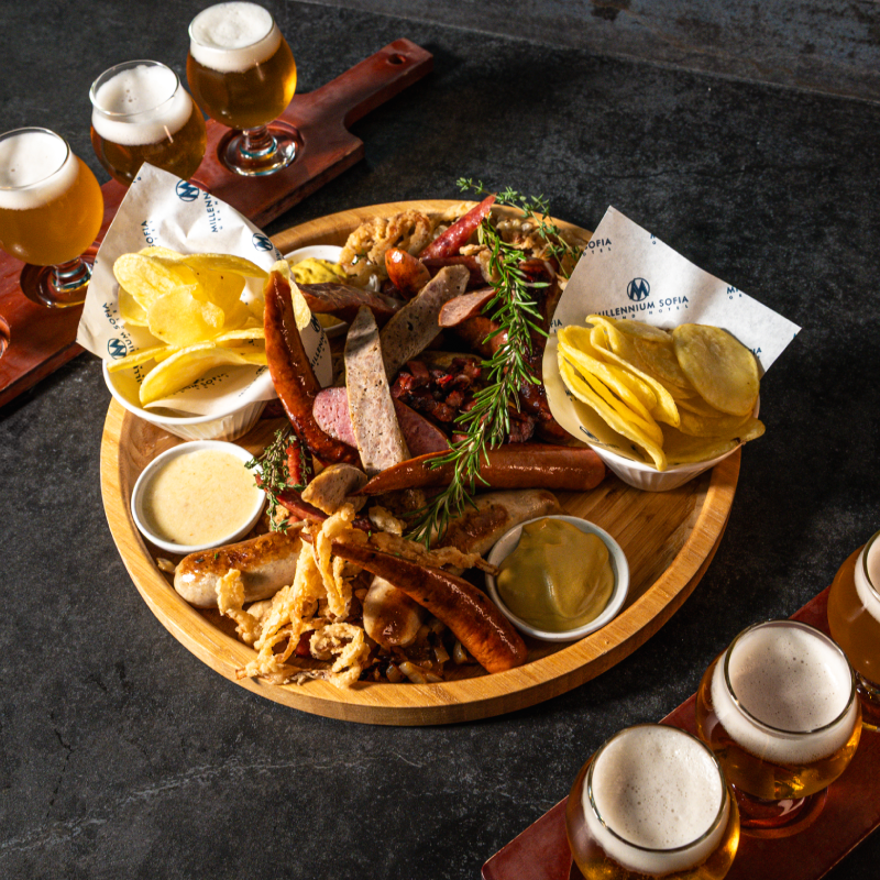 - А plateau of authentic German and Hungarian wursts accompanied by a selection of mustards, horseradish paste and toasted onion
