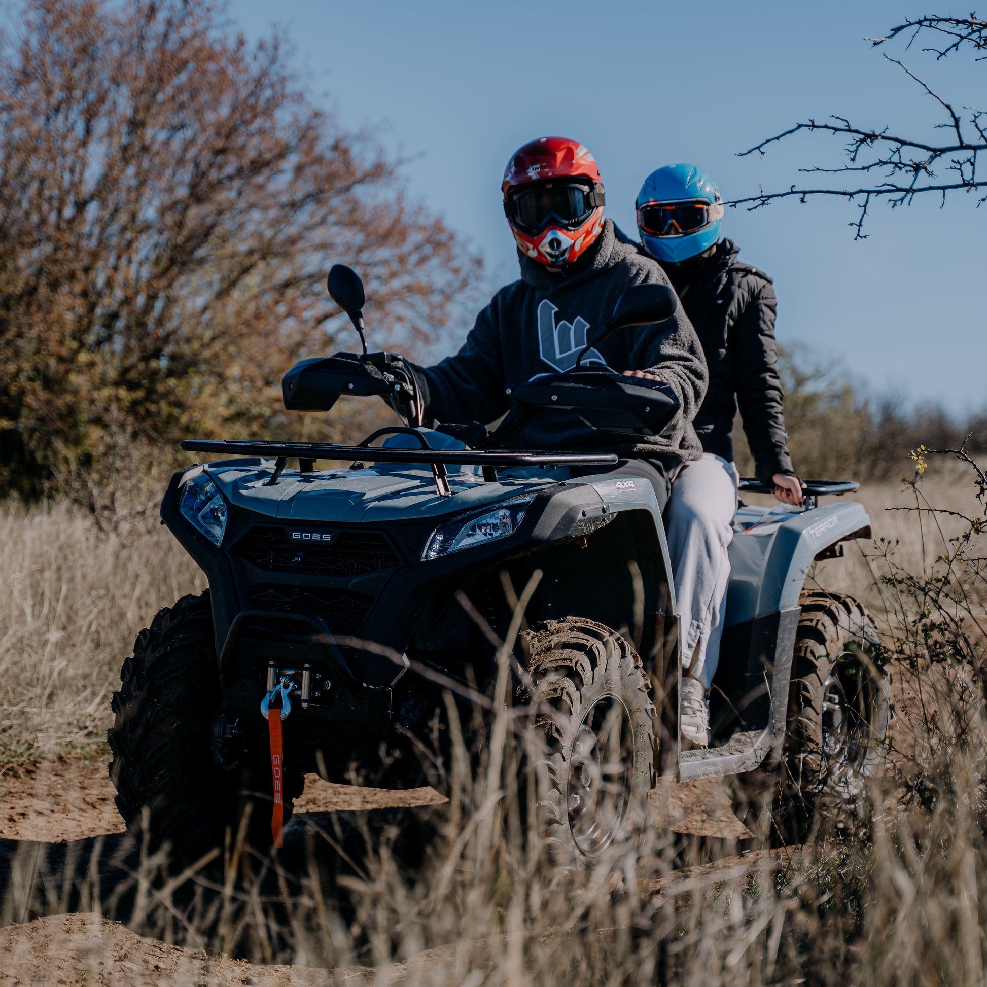 There are 2 single-seat ATVs, 200cc. The minimum age for driving them is 16, and only when accompanied by a parent on another vehicle. For teenagers between 12 and 16 years old, we offer family rides with children; 4 double-seat ATVs, 400cc, with 4x4 drive. To drive a 400cc ATV, you must be at least 18 years old and hold a valid “B” category driving license.
