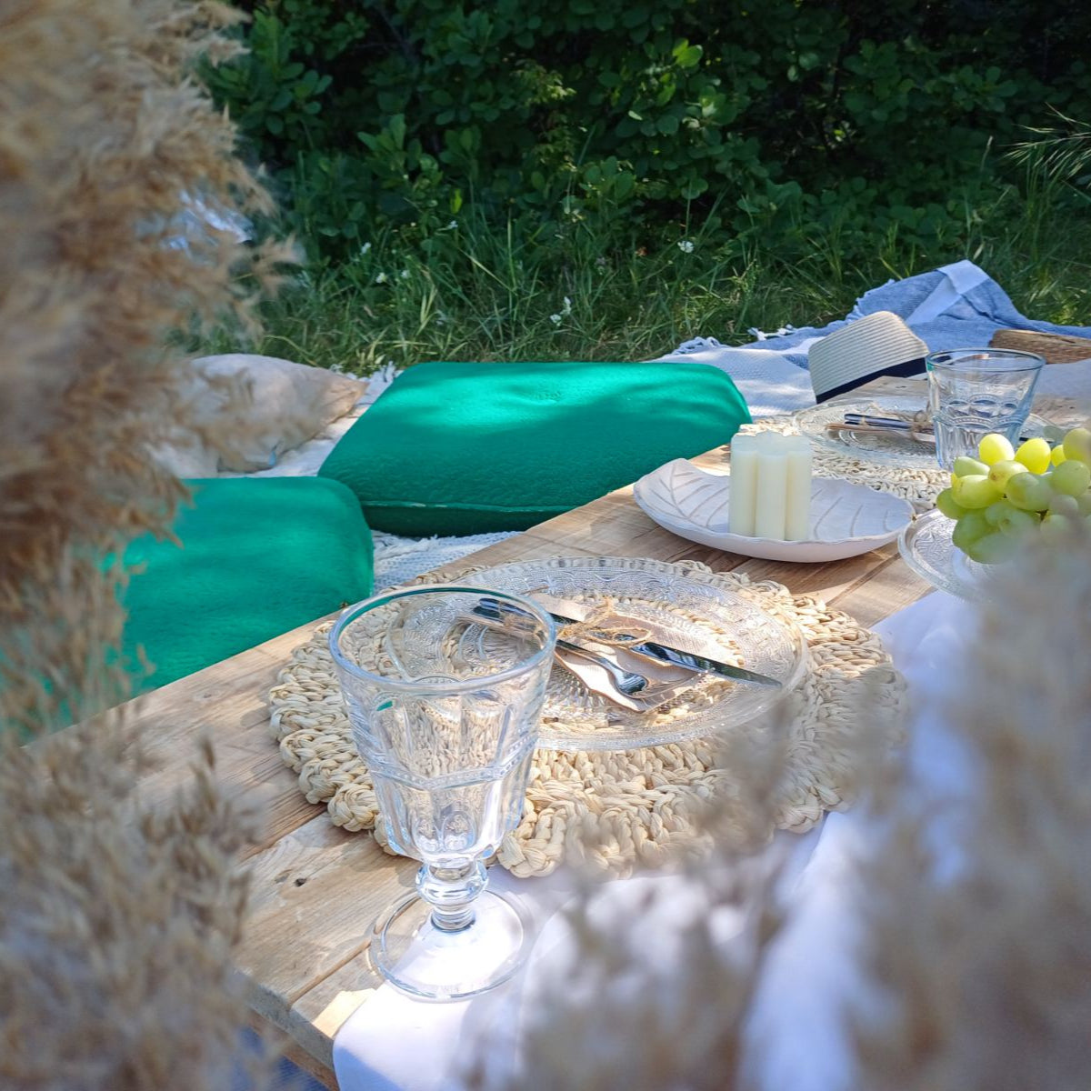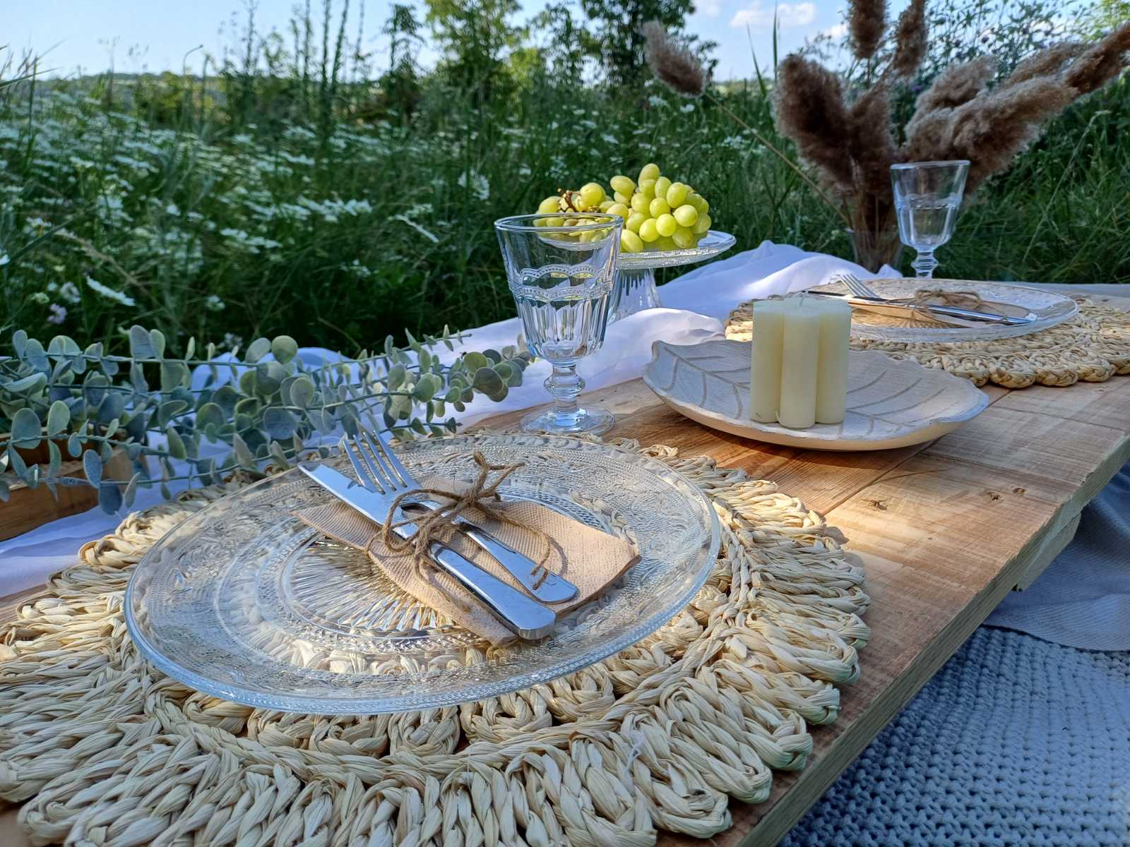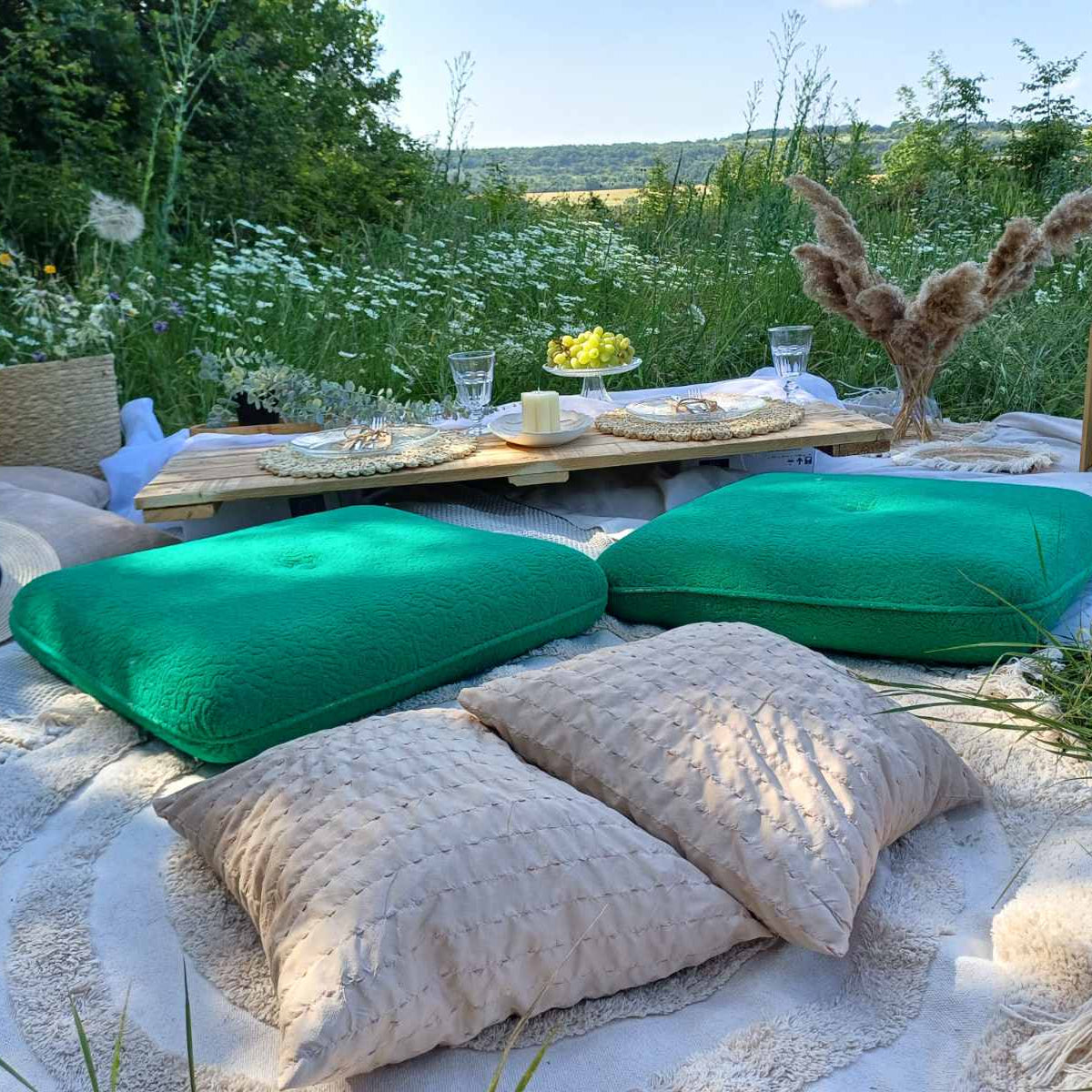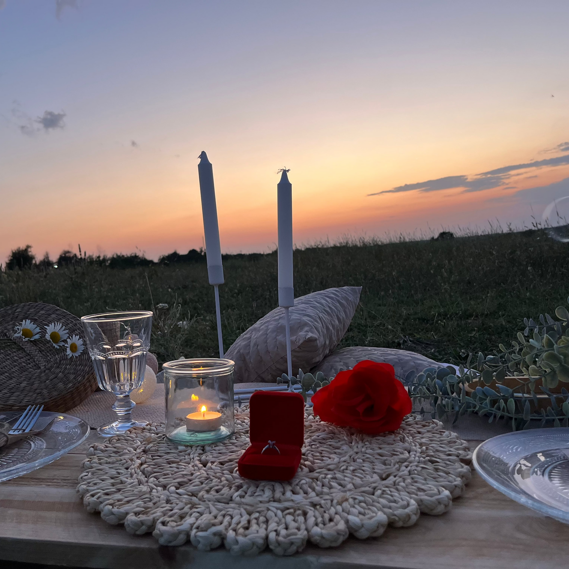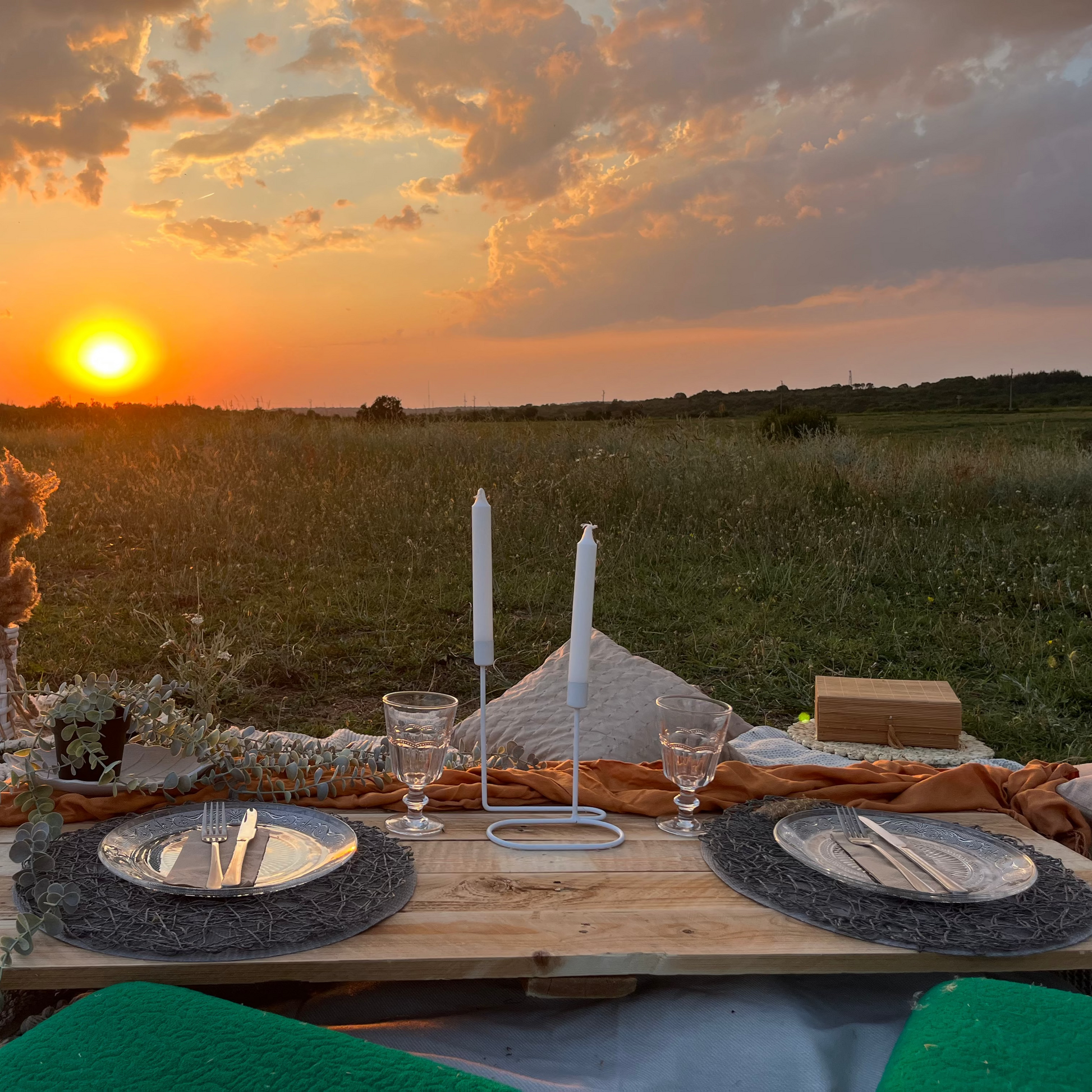 Your private picnic spot is lovingly decorated in a romantic theme – complete with cushions, a small table, charming lights, and elegant tableware to set the mood. Choose between a midday picnic with sweeping natural views , or a sunset picnic that glows with fairy lights and intimacy.