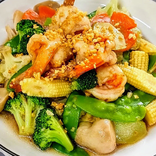 Stir-Fried Mixed Vegetables – A colorful selection of fresh vegetables, stir-fried in a wok with Thai sauce