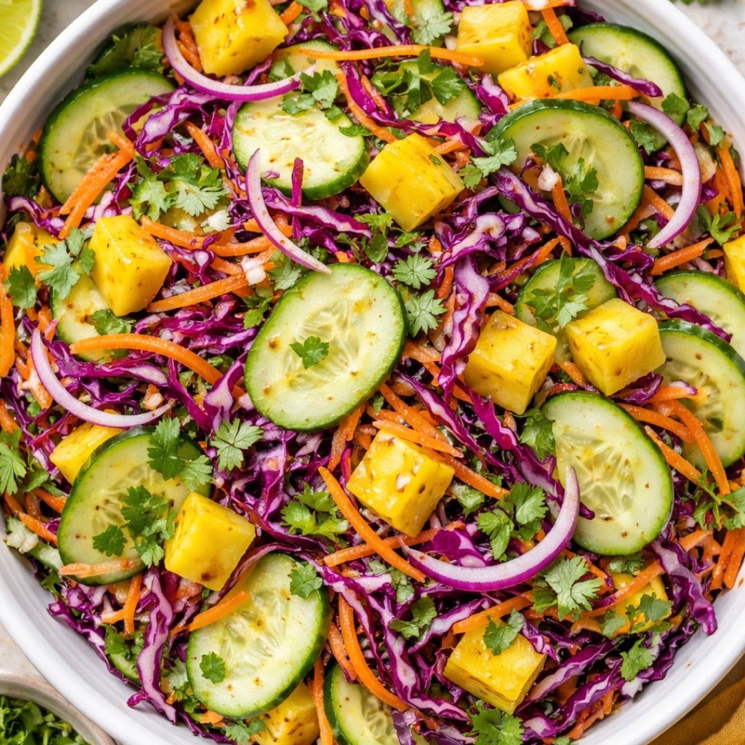 Tropical Salad with Cucumber, Mango & Red Cabbage – fresh, juicy, and vibrant—the crunch of the vegetables paired with the natural sweetness of mango and a gentle acidity that awakens the appetite and refreshes every bite.