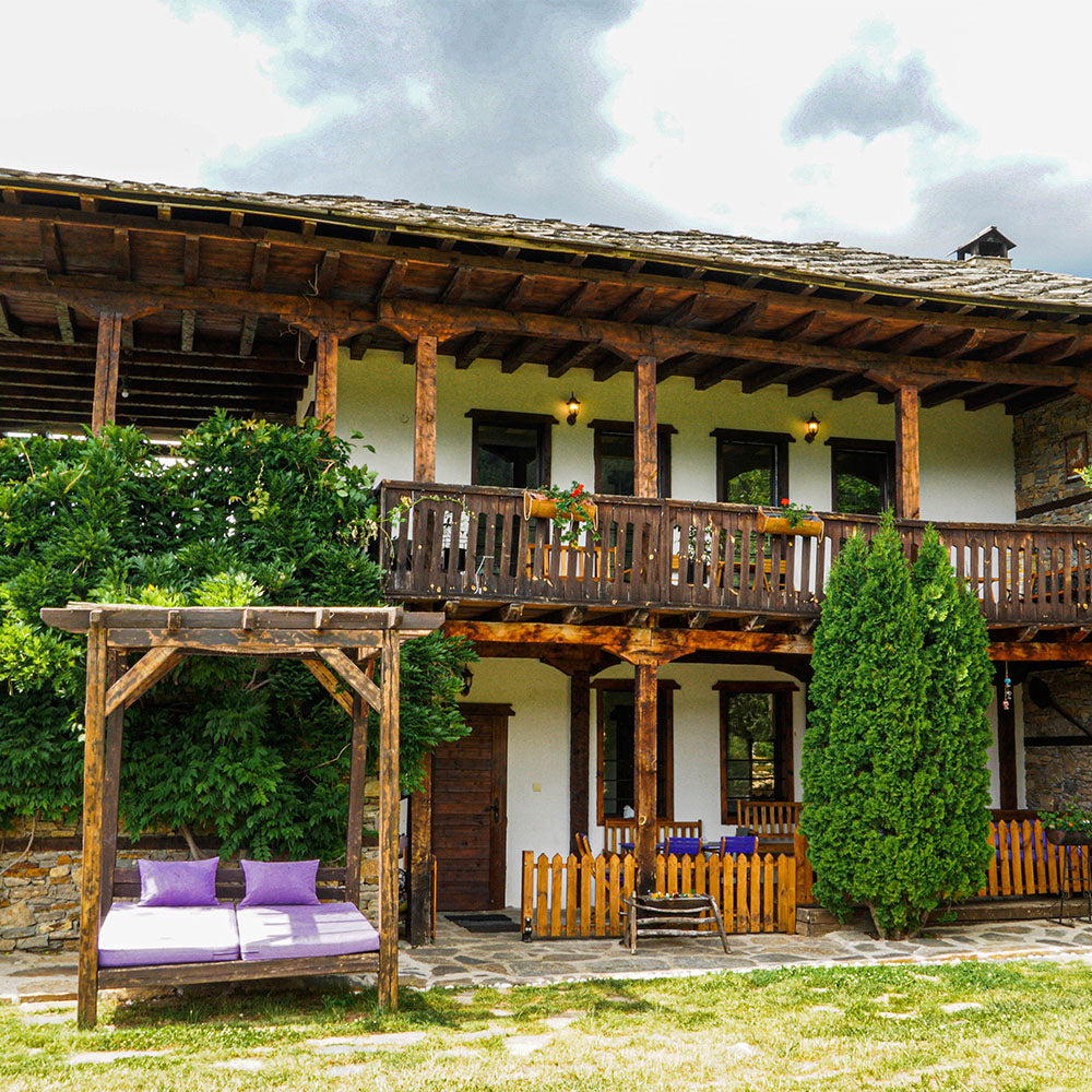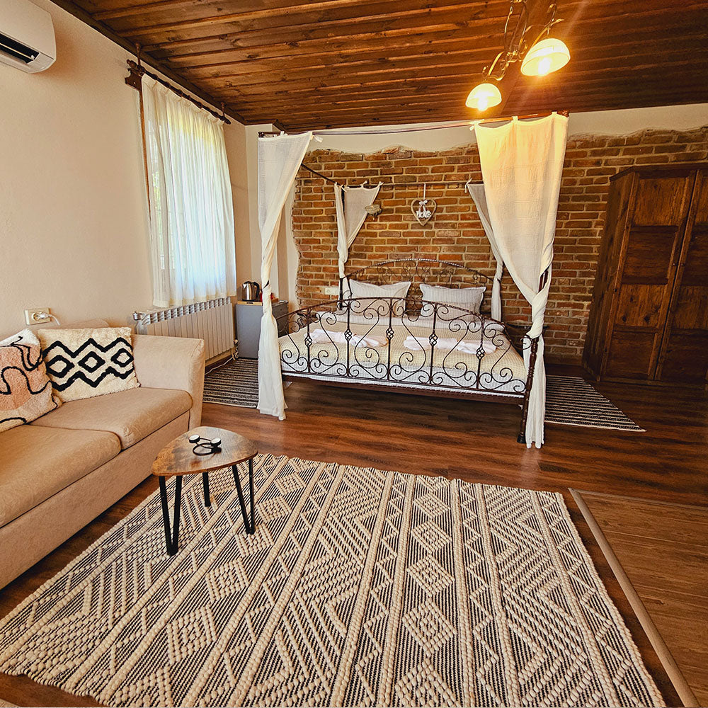 There are two types of rooms in the house: standard and deluxe. Standard rooms are equipped with King Size bed, a sofa bed, own toilet and bathroom, minibar, an electric kettle, coffee and tea, toiletries, towels, balconies and panoramic view overlooking Rhodope mountains, Pirin mountain and Leshten. The rooms also have a smart TV and wi-fi.